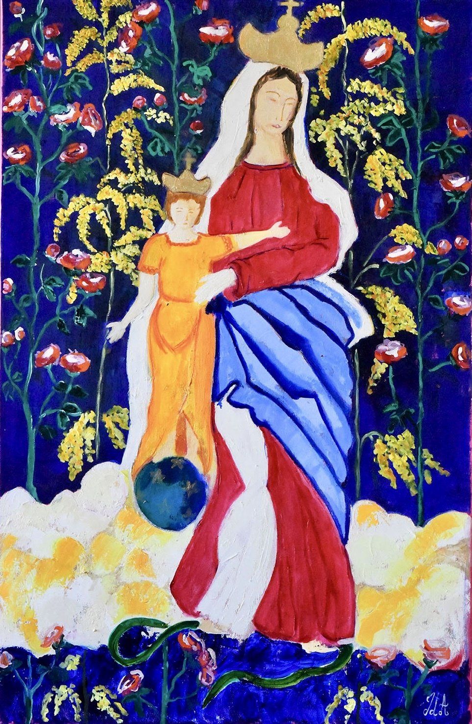 Marie est la mère du Christ. Élevée dans une famille catholique je ne pense à personne d’autre, sinon à quelques bonnes amies, à l’évocation de ce prénom. Marie c’est cette femme, douce, dévouée, sensible et protectrice que l’on prie et invoque pour qu’elle nous présente à son fils. C’est souvent la première que l’on a prié enfant, à cette période où rien n’est plus précieux qu’une mère. Ce prénom d’une simplicité déconcertante contient en lui-même l’histoire de nombreux peuples et fait l’objet de représentations infinies. Pourtant nous ne connaissons pas ses traits réels. Chaque peuple la représentera sous les traits des femmes les plus pures qu’il connaisse. Ces représentations sont également influencées par ses diverses apparitions mais finalement son vrai visage reste un mystère. Parce que ce n’est pas très important, Marie est celle qui est proche de nous et nous montre un chemin par son caractère et sa pureté. Et c’est parce que le Bon et le Beau sont liés que les peintre ou sculpteurs qui l’ont représentée lui ont toujours attribué les visages les plus gracieux. Et ces illustrations sont nombreuses, de l’Annonciation à l’Assomption en passant par la Nativité et le pied de la Croix, tous ces moments ont été l’occasion de nous la montrer. Et pourtant, il en manque encore… Nous n’avons jamais vu de « Marie en colère » ou de « Marie qui se fâche »... La figure de Marie est toujours rassurante. Contrairement à Jésus qui réprimande les marchands du temple et qui nous parle du jugement dernier, jamais Marie ne fait peur ! Mais on ne retrouve pas non plus « Marie qui chante », « Marie qui rit » ou « Marie qui danse ». Et personnellement ces représentations me manquent car je ne doute pas que cette femme qui a aimé le monde et élevé le Christ a probablement chanté des berceuses, ri aux premiers pas de son enfant et dansé aux noces de Cana… Alors c’est une chance, car sur ce sujet qui nous dépasse il reste un travail fou à accomplir pour continuer de montrer au monde les différentes facettes de cette femme remarquable. Julie d’Aragon
